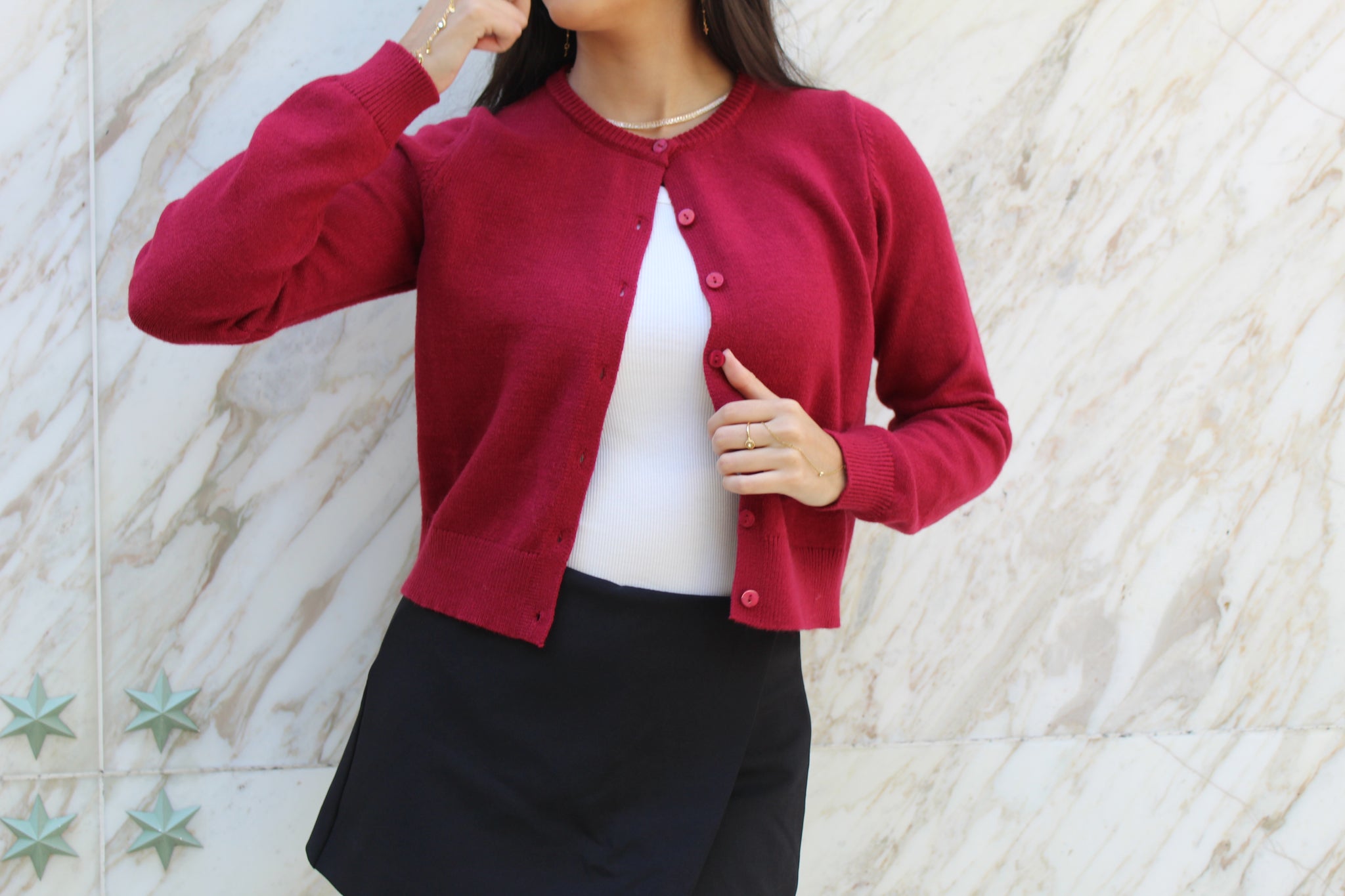 Say hello to cozy-chic vibes with the Amelia Knit Cardigan - your new favorite layering piece with a flirty twist. Designed with a soft knit and a semi-cropped length, this playful cardi features a front button closure and long sleeves for everyday ease
