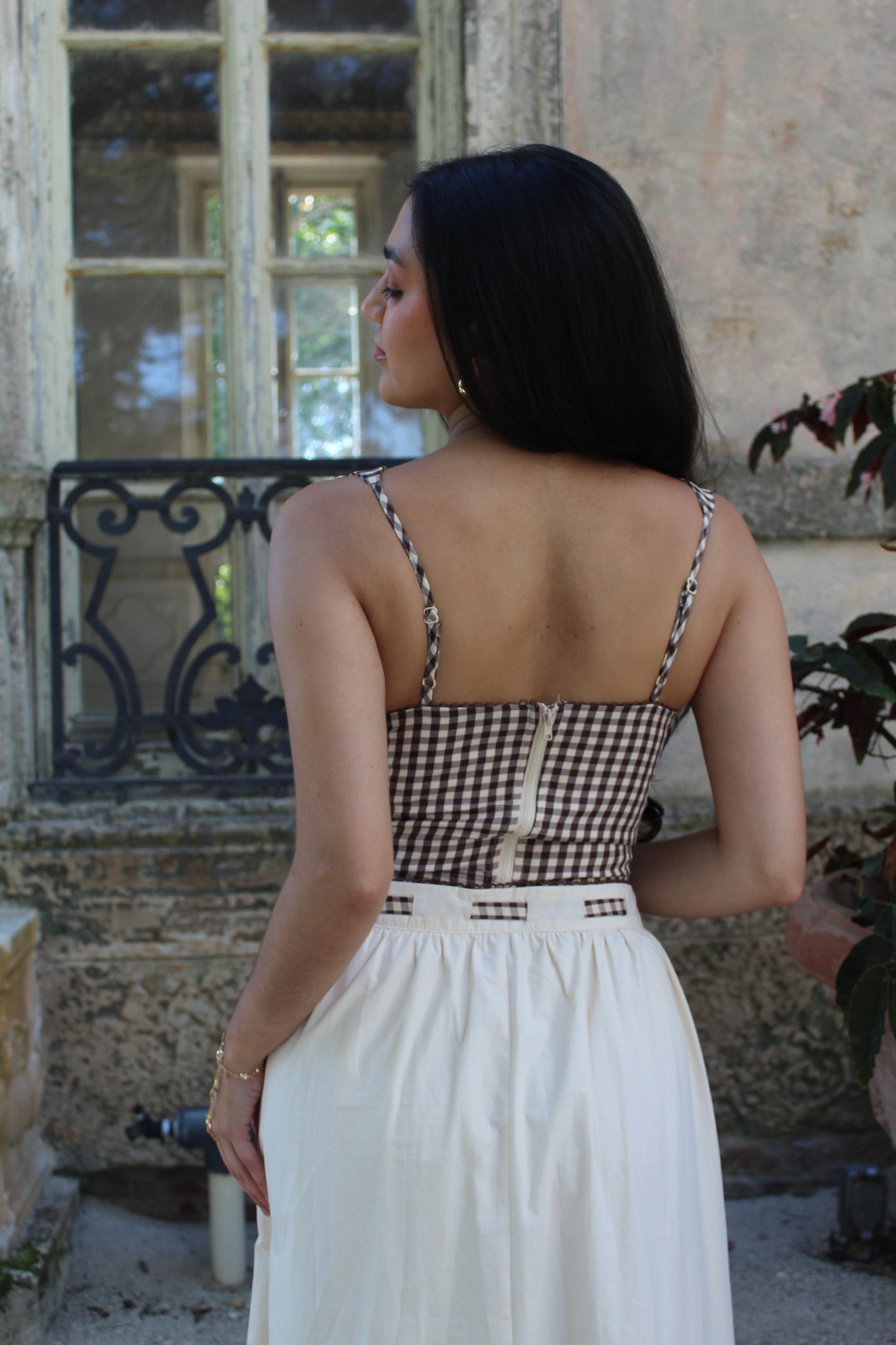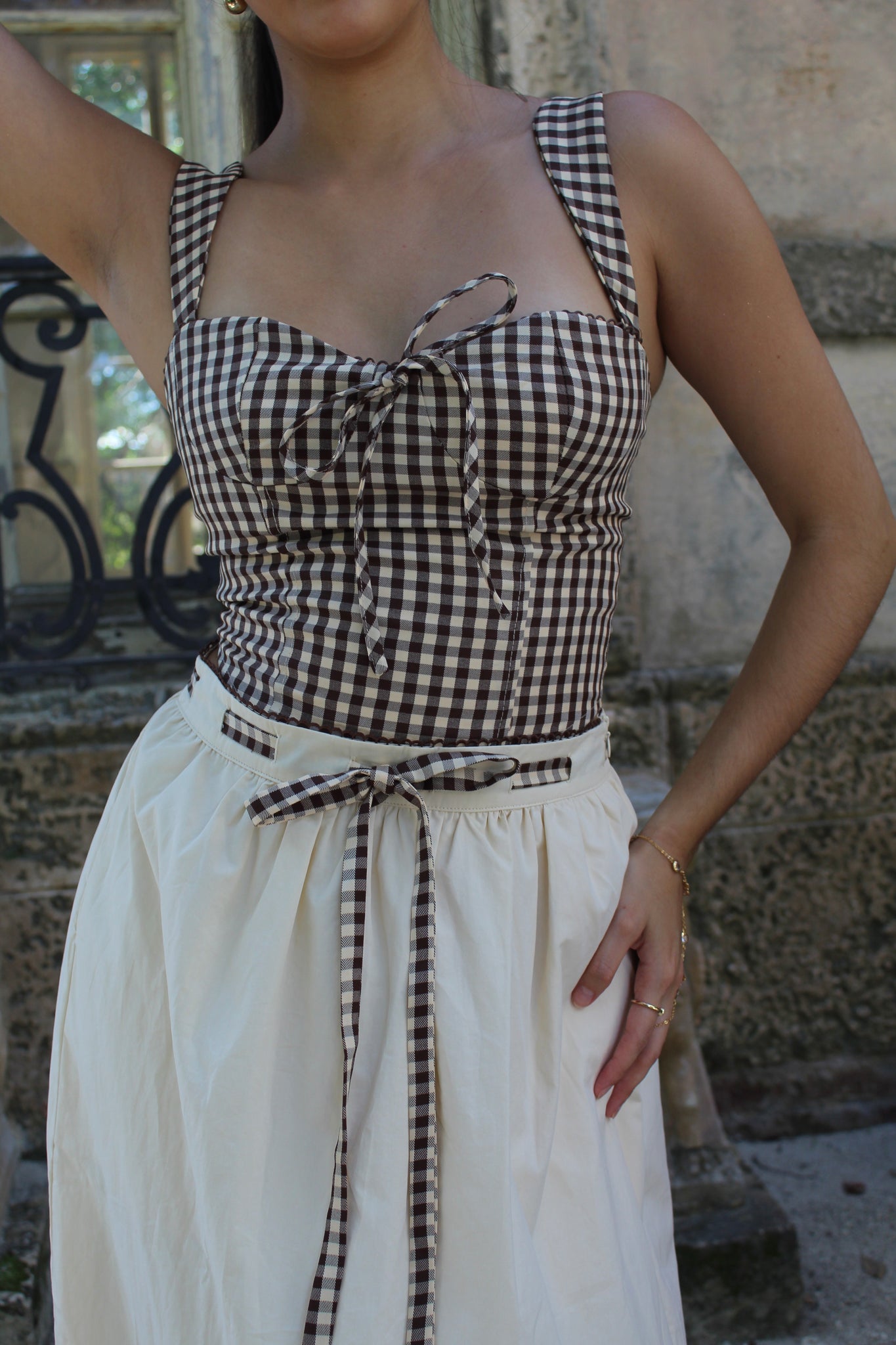 This gingham corset-style top brings a fresh countryside charm with a modern, feminine twist. Featuring a sweetheart neckline, adjustable wide straps, and a ruched front detail that enhances the silhouette, it’s both structured and effortlessly chic. The fitted bodice accentuates the waist while the checkered print adds a timeless touch — perfect for pairing with flowy skirts or high-waisted trousers for an elevated rustic look.